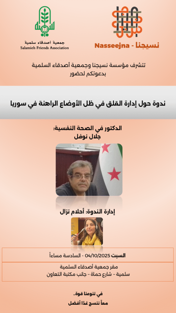 تهدف هذه الندوة إلى مناقشة أبرز التحديات النفسية التي يواجها المجتمع السوري في ظل الظروف الحالية، والتركيز على سبل التعامل مع القلق والضغوطات النفسية خلال الفترات الصعبة. ستتناول الجلسة أهم القضايا المتعلقة بالصحة النفسية وكيفية تقديم الدعم للأفراد في مواجهة الأزمات.