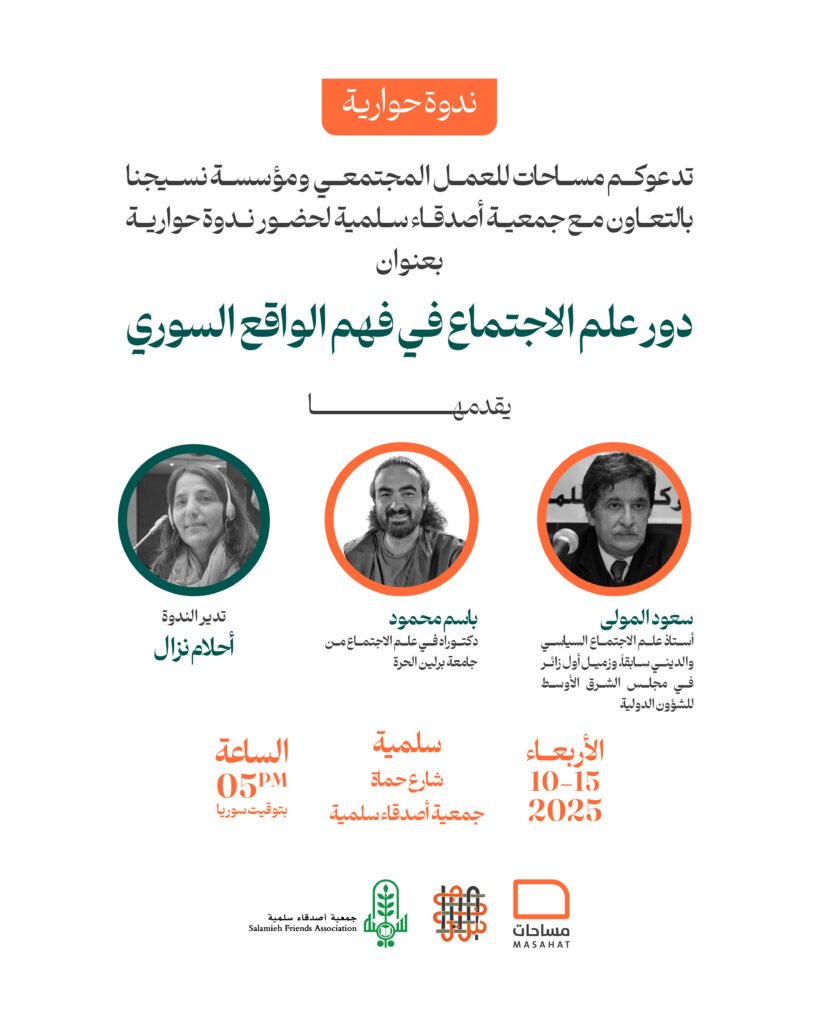 تدعوكم كل من “مساحات للعمل المجتمعي” و”مؤسسة نسيجنا” بالتعاون مع “جمعية أصدقاء سلمية”، لحضور ندوة حوارية بعنوان: “دور علم الاجتماع في فهم الواقع السوري”. تهدف الندوة إلى مناقشة الجوانب الرئيسية لدور علم الاجتماع في تفسير وتحليل التغيرات والتحديات التي يواجهها المجتمع السوري.